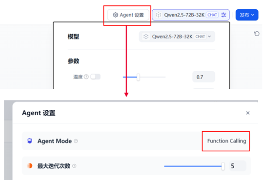 在agent设置中可以看到dify已自动将agent mode切换到了function calling模式。