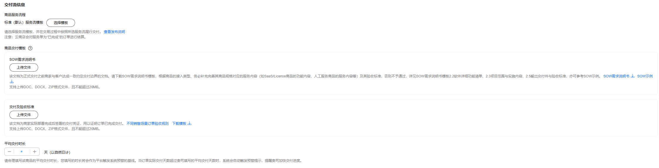 - 交付流信息用于规范软件商品线下交付后,客户在验收环节需审核的交付物及内容,其中包含商品交付模板(sow需求说明书、交付及验收标准)、平均交付时长。