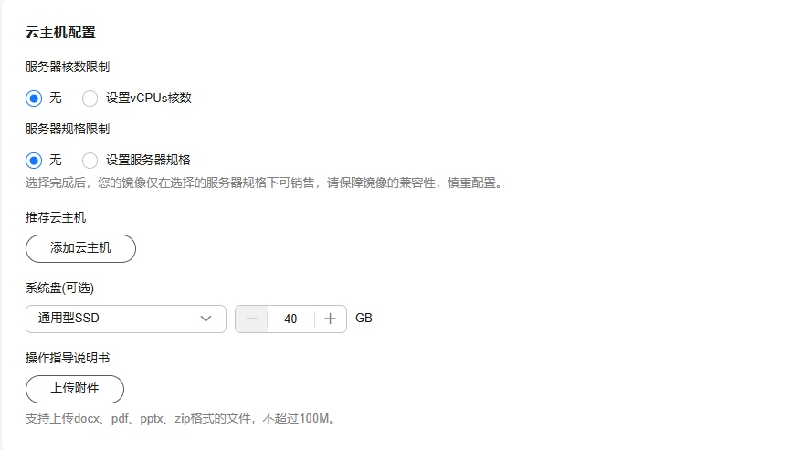 支持对镜像适配的服务器核数、服务器规格类型、系统盘的大小等进行配置,例如您的镜像只支持适配鲲鹏服务器,请设置限制安装的服务器规格。