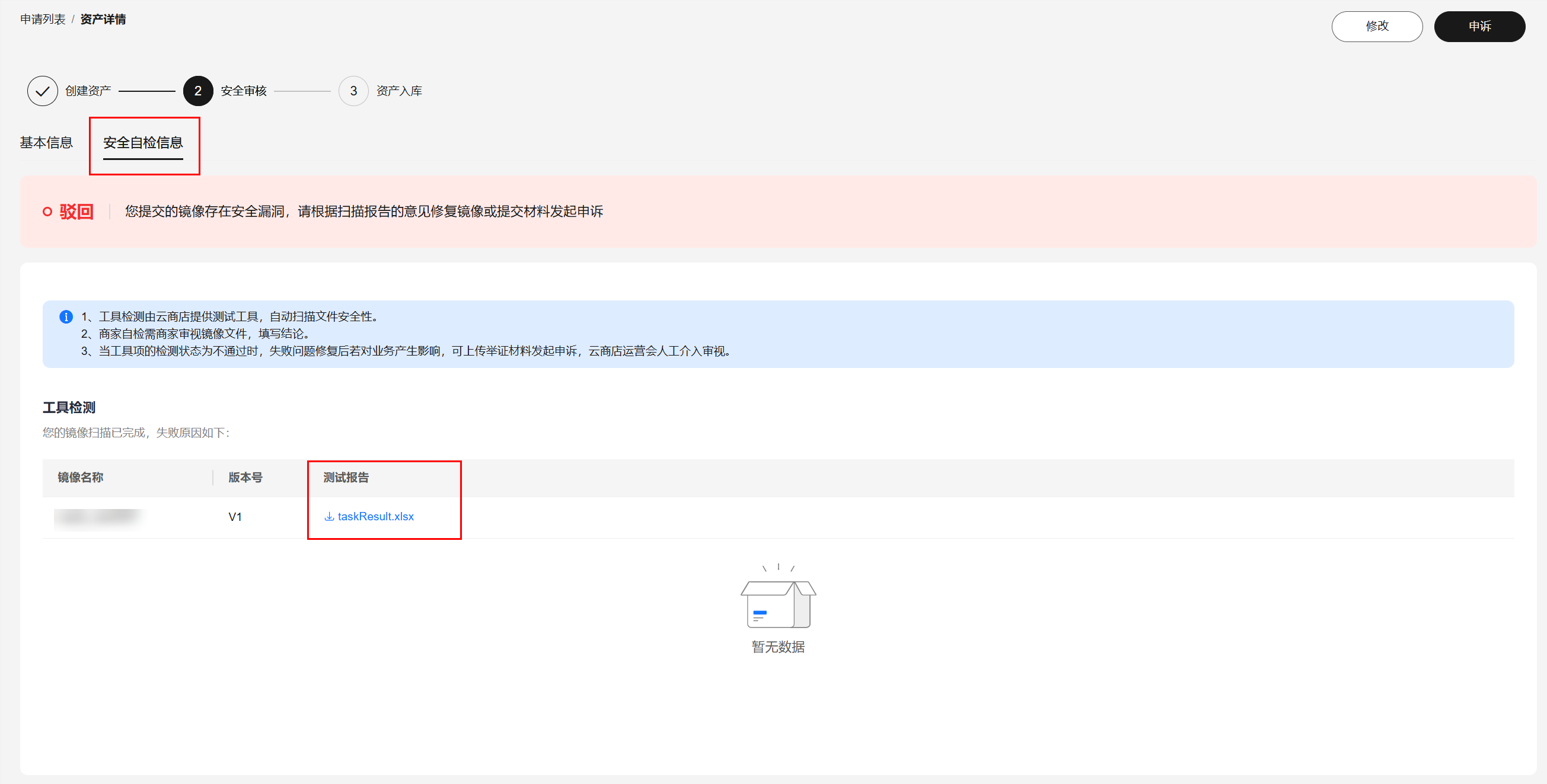 - 如安全问题已完成整改,单击“修改”,重新上传已修复的镜像资产后再次提交审核。