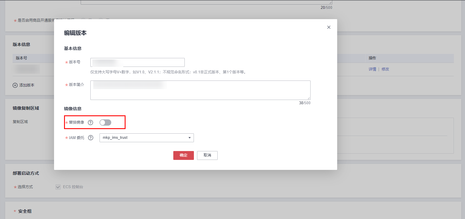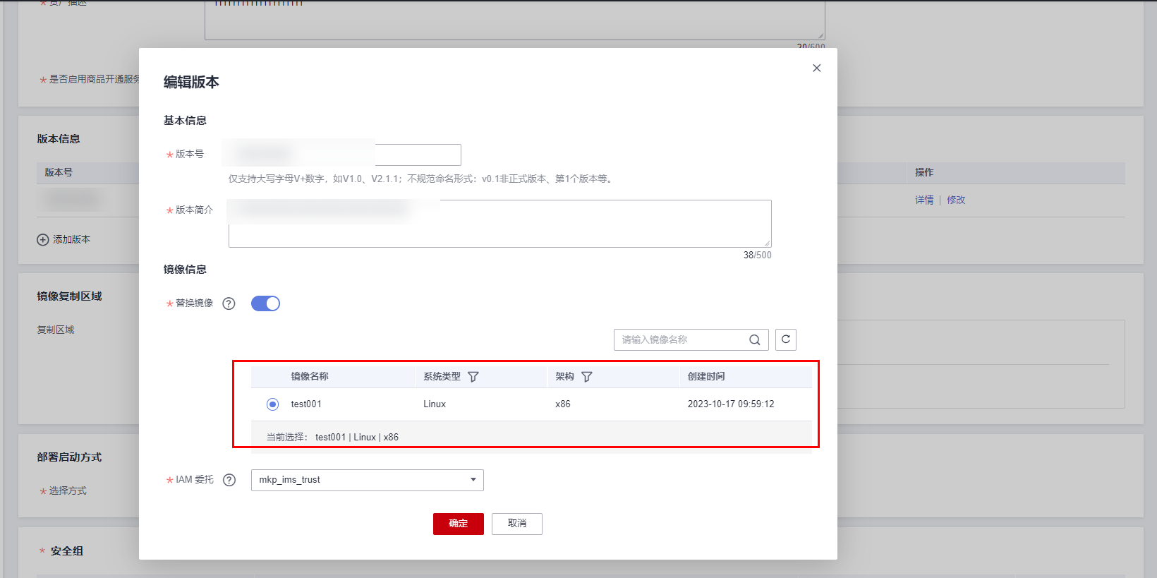 单击打开“镜像信息”栏“替换镜像”按钮,选择需要替换的镜像后,单击“确定”。