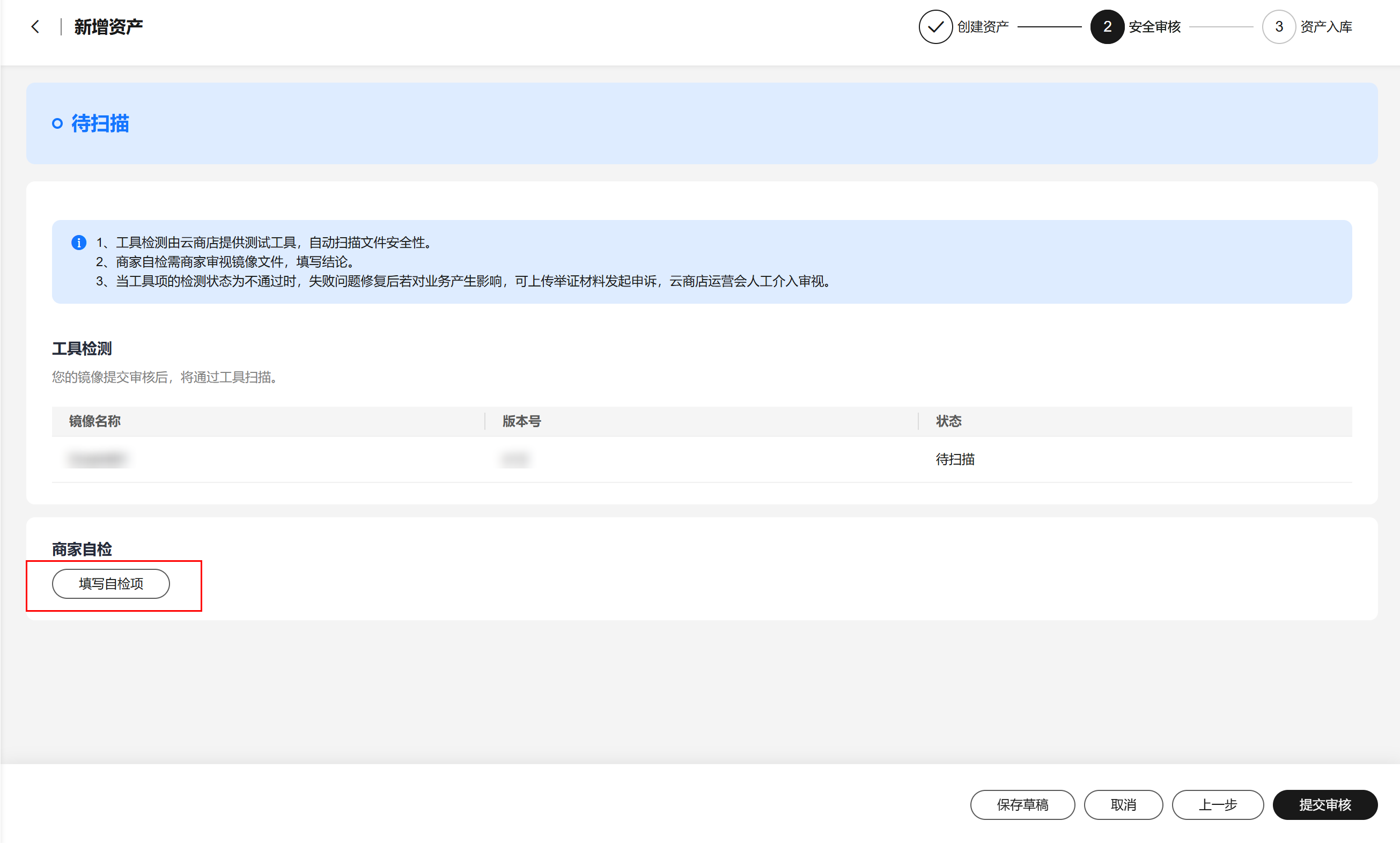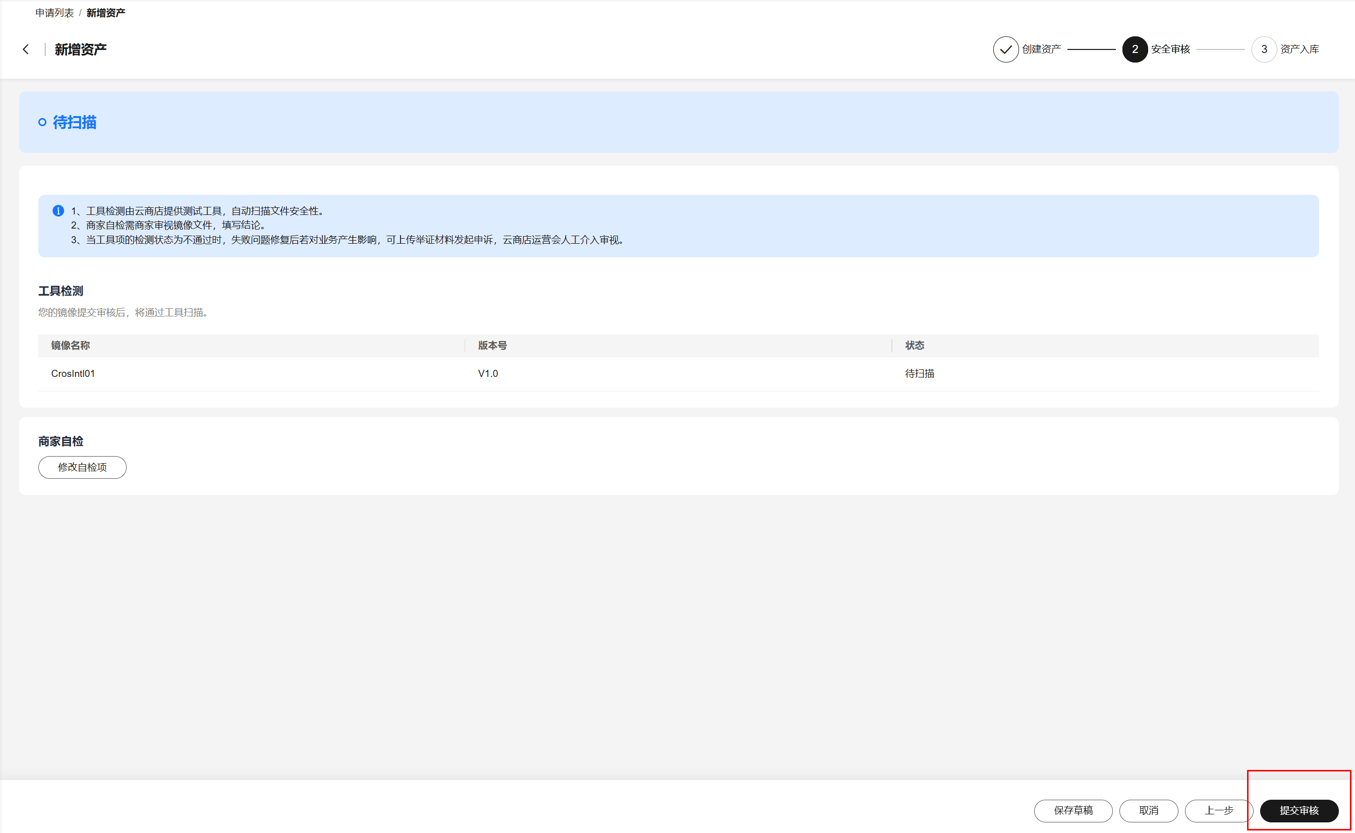 - 勾选商家自检项,单击“提交审核”:进入安全测试审核阶段,并提交完成后可查看资产审核状态。