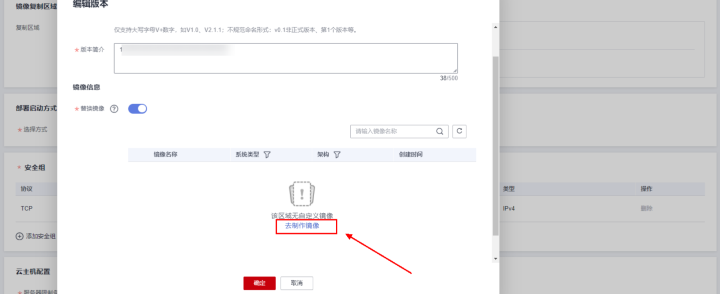 - 添加镜像信息时,若没有需要的镜像,可单击“去制作镜像”进入云管路台制作镜像。