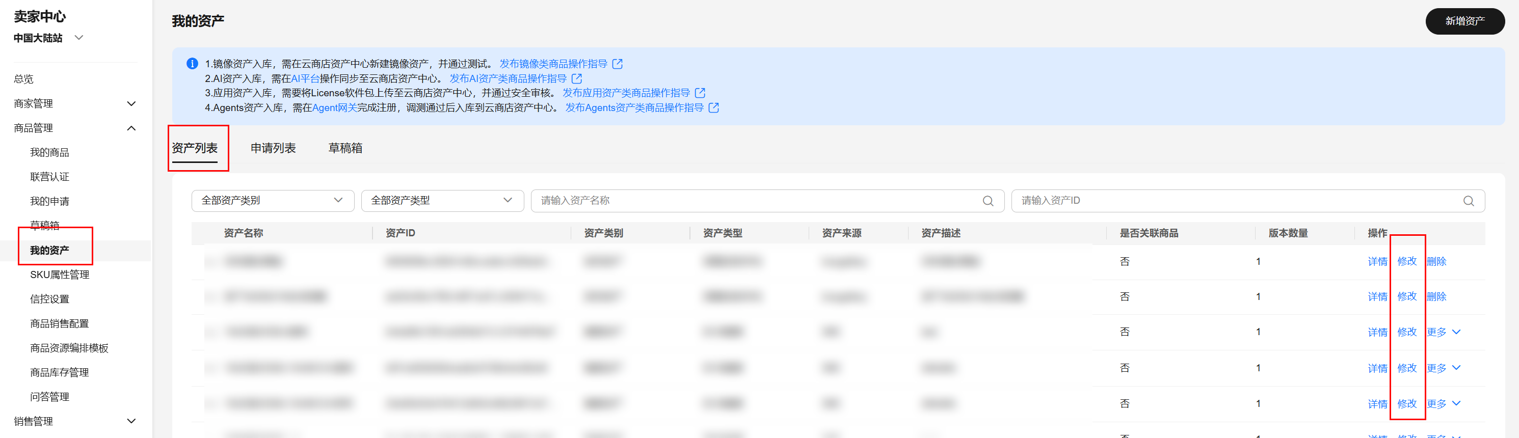 - 在“商品管理>我的资产”页面,搜索需要修改的资产,单击操作列的“修改”,进入“修改资产”页面。