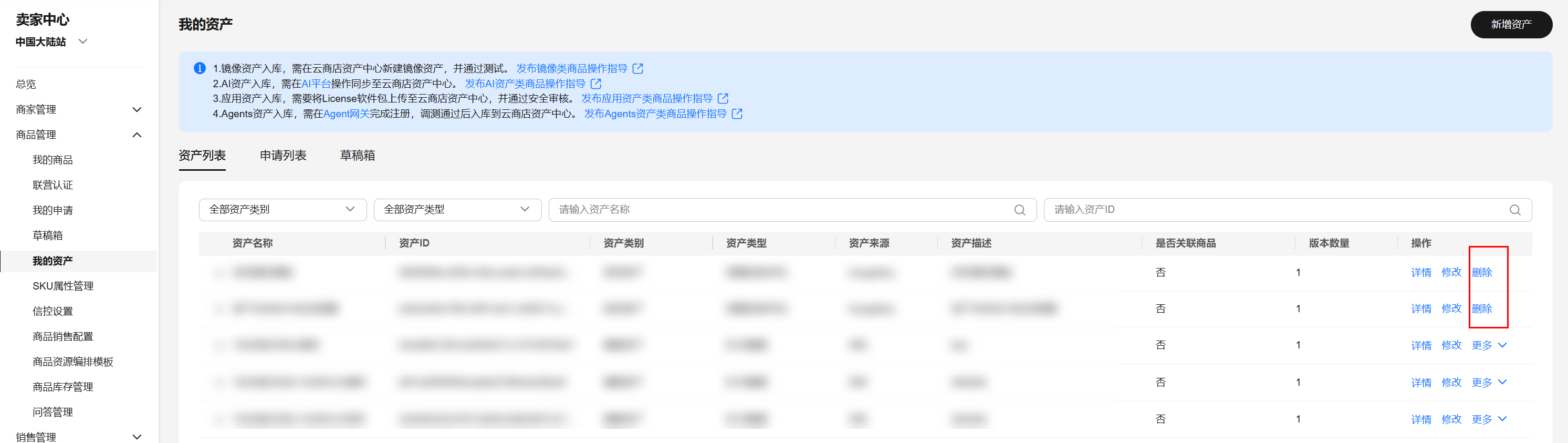 - 新增资产:进入页面,单击左侧导航栏的“商品管理>我的资产”,单击页面右上角的“新增资产”。