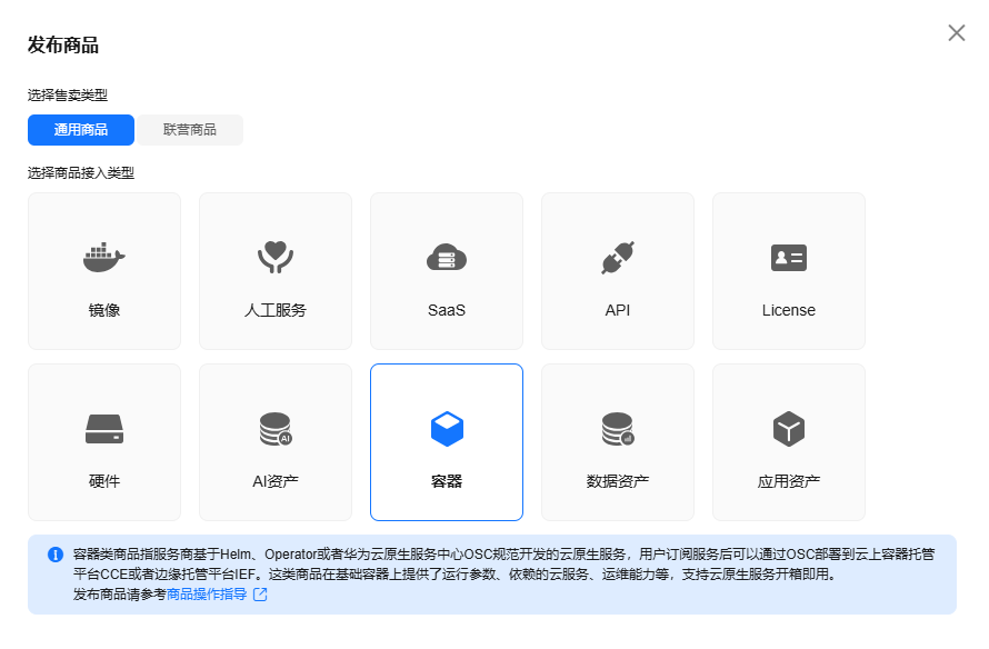 - 发布商品:进入””单击右上方“发布商品”,选择售卖类型,接入类型选择“容器”,单击“完善商品信息”。登录已成功入驻云商店的华为云账号,单击页眉导航处的“卖家中心”,进入页面。