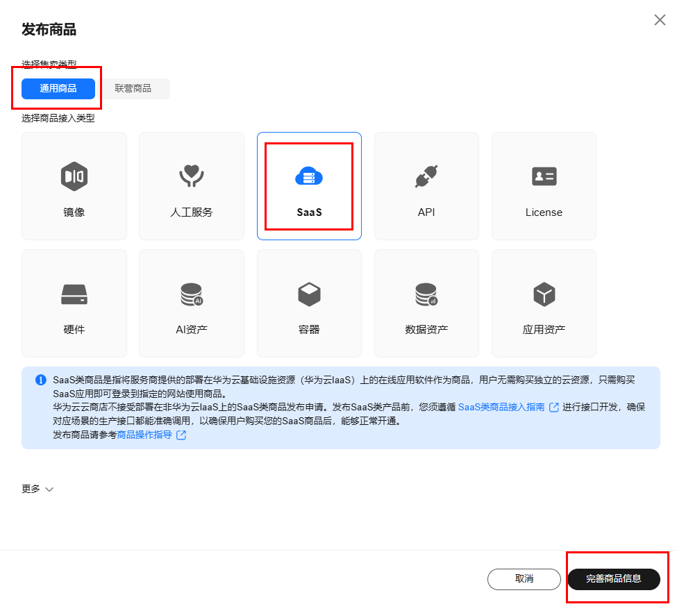 - 发布商品:进入””单击右上方“发布商品”,选择售卖类型,接入类型选择“saas”,单击“完善商品信息”。