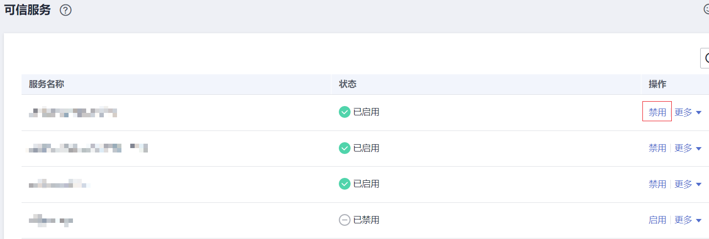 - 进入可信服务页,在列表中单击云服务操作列的“禁用”。