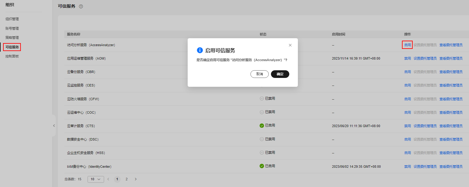- 进入可信服务页,在列表中单击云服务操作列的“启用”。
