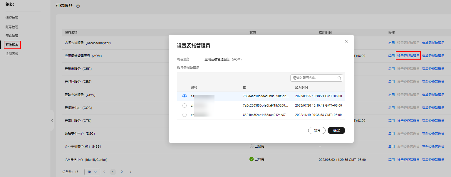 - 进入可信服务页,在列表中单击云服务操作列的“设置委托管理员”。