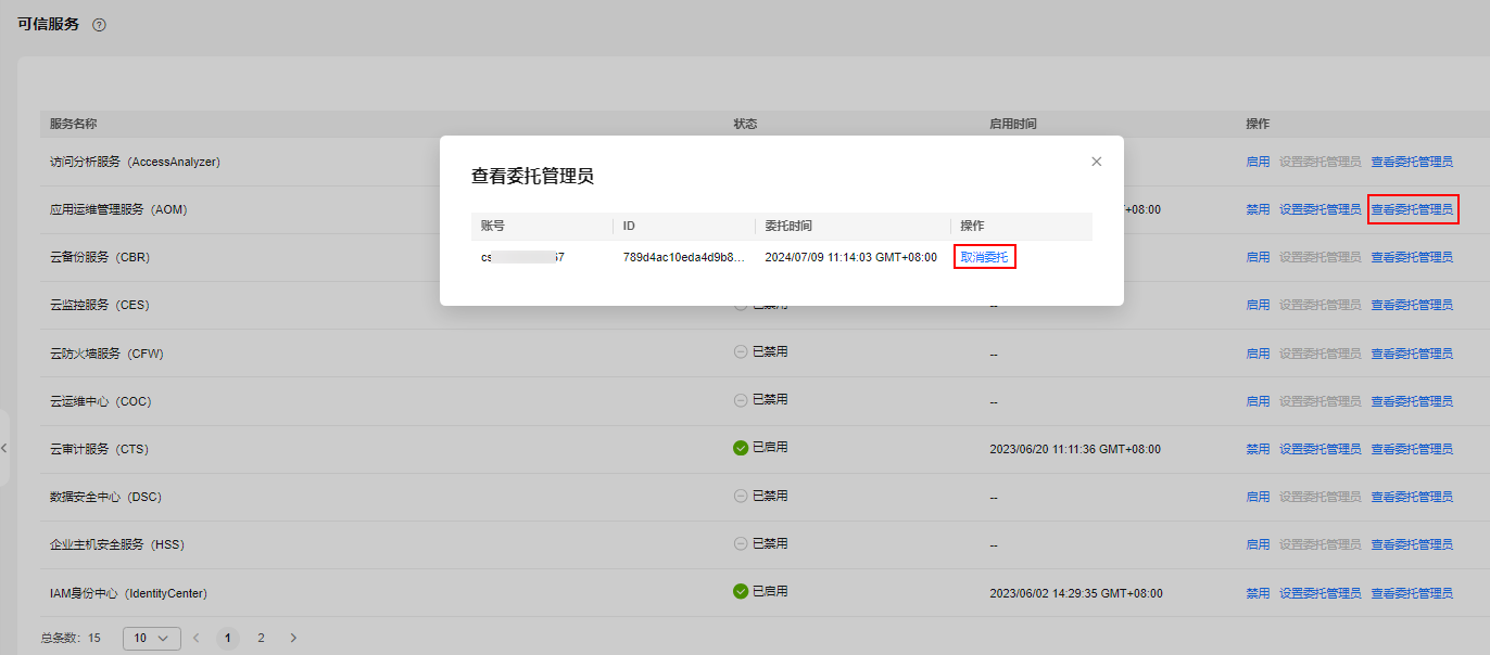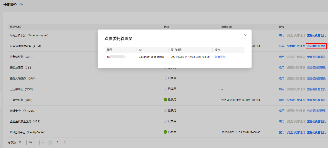 - 进入可信服务页,在列表中单击云服务操作列的“查看委托管理员”。