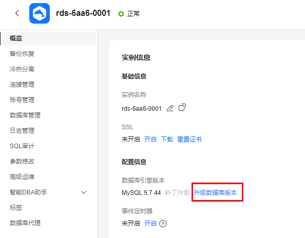 - 在“概览”页面的“数据库引擎版本”处,单击“升级数据库版本”。
