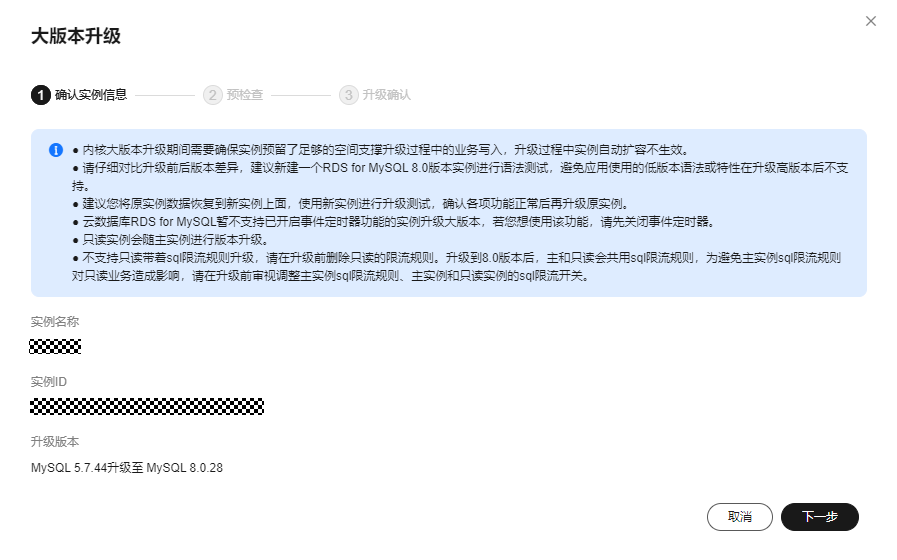- 在弹出框中,确认升级信息,然后单击“下一步”。