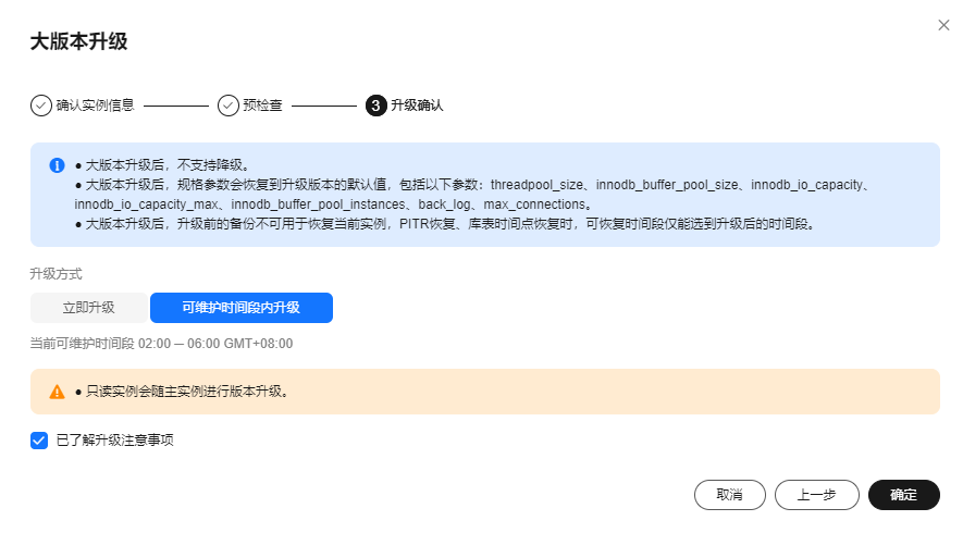 - 可维护时间段内升级:系统会在您设置的可维护时间段内,升级您的数据库版本到当前5.7或8.0最新版本。详情请参见设置可维护时间段。