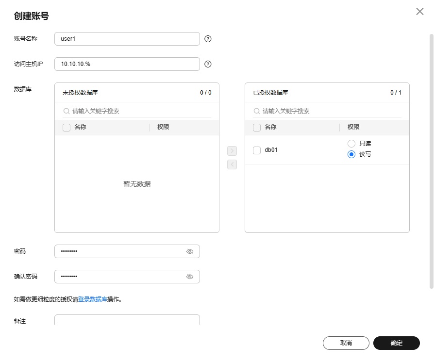 - 在“创建账号”弹出框中,输入账号名称、主机ip、授权数据库,并输入密码和确认密码,单击“确定”。