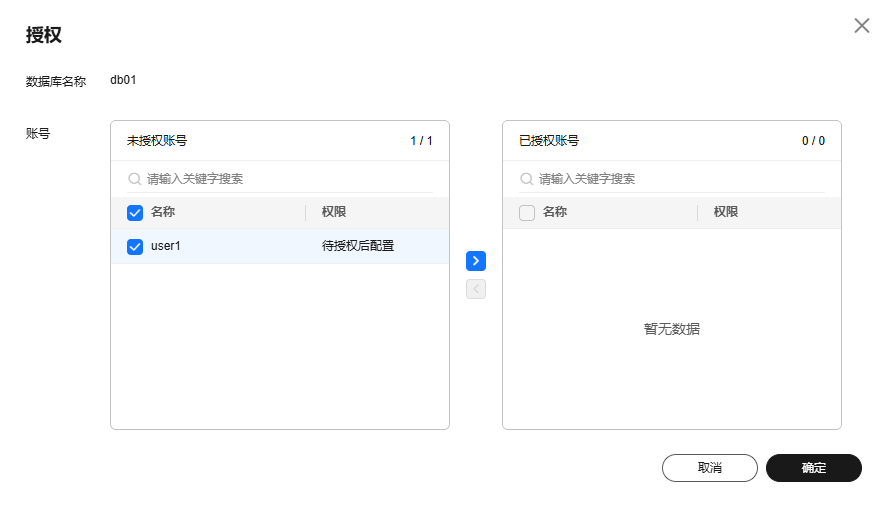 您可将自己创建的数据库账号,授权给指定的数据库,对于已授权的数据库账号,您也可取消授权。
