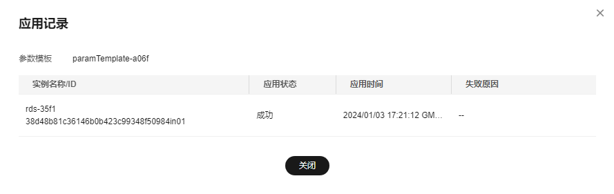 您可查看参数模板所应用到的实例名称/id、应用状态、应用时间、失败原因。
