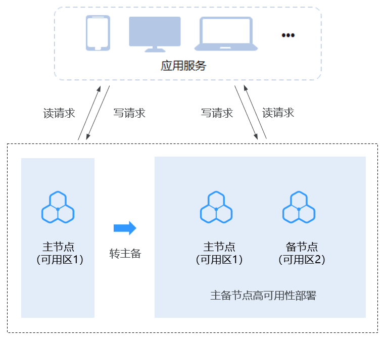 主备实例采用一主一备的经典高可用架构。当主备实例的主节点发生虚拟机、硬盘、网络等故障时,会自动触发故障倒换,备机快速接管业务。建议您将主备实例选择到不同的可用区,享受跨可用区,同城容灾的高可用服务。