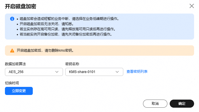 - 可维护时间段内变更:系统会在您设置的可维护时间段内开启磁盘加密。