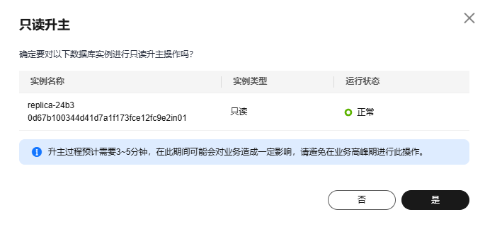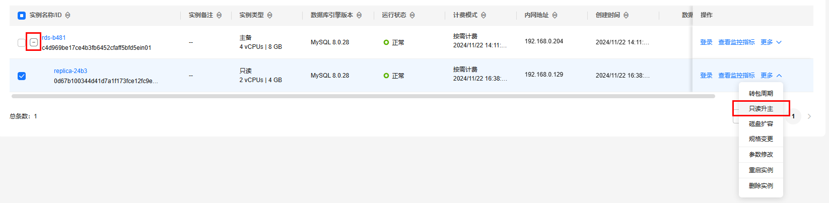 - 只读升主成功后,用户可以在“实例管理”页面对其进行查看和管理。