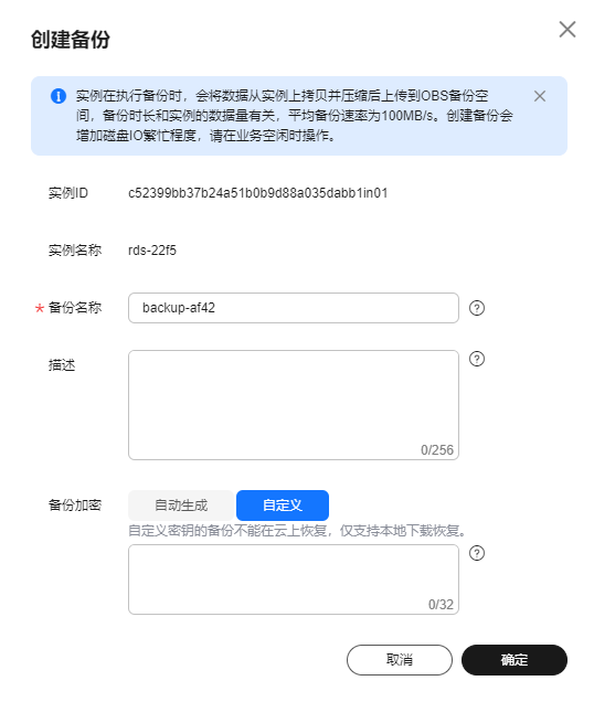 - 通过管理控制台创建手动备份时,按提示输入自定义的密钥字符串,对数据进行重新加密,详情请参考创建手动备份。