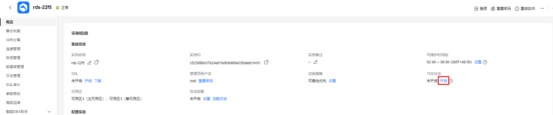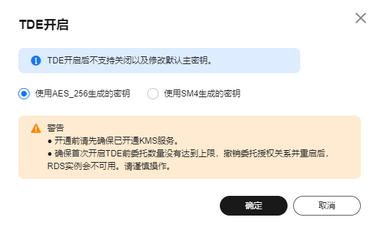 - 在弹出框中,单击“确定”,开启tde加密功能。