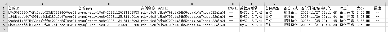 云数据库rds支持导出备份,用户可以通过导出备份功能将备份信息(实例名称,备份开始时间,备份结束时间,备份状态,备份大小)导出到excel中,方便用户查看并分析备份信息。