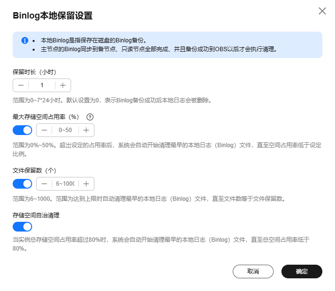 默认开启,无法关闭,但默认保留时长为0,即binlog备份成功后本地日志会被删除。 如需自定义时长保留本地日志,详见操作步骤。 |