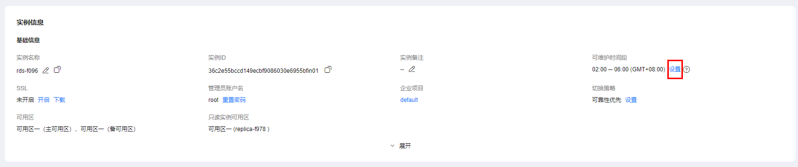 ,选择“数据库 > 云数据库 rds”,进入rds信息页面。 - 在“实例管理”页面,单击目标实例名称,进入“概览”页面,在“可维护时间段”处单击“设置”。