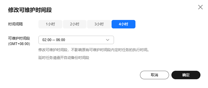 默认可维护时间段为02:00~06:00,您可以根据业务需求,设置可维护时间段。建议将可维护时间段设置在业务低峰期,避免业务在维护过程中异常中断。
