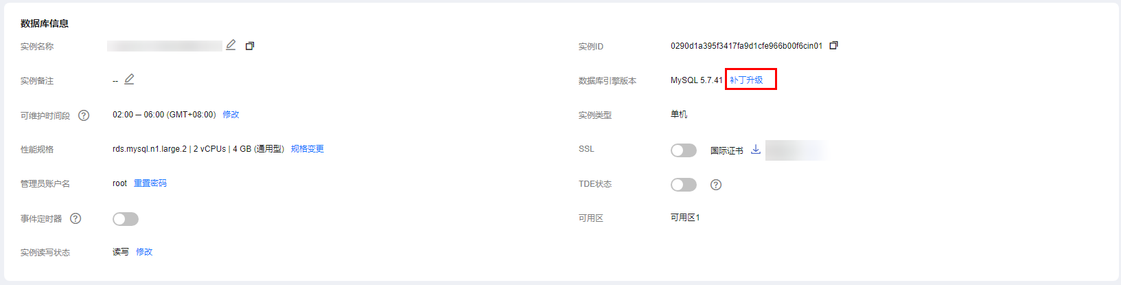 - 在“概览”页面的“数据库引擎版本”处,单击“补丁升级”。