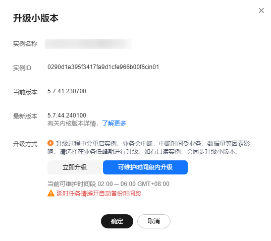 - 可维护时间段内升级:系统会在您设置的可维护时间段内,升级您的数据库内核版本到当前最新版本。