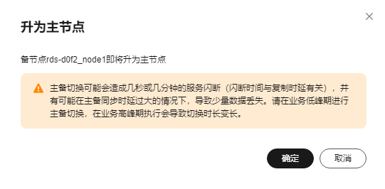 - 请在业务低峰期进行主备切换,在业务高峰期执行会导致切换时长变长。