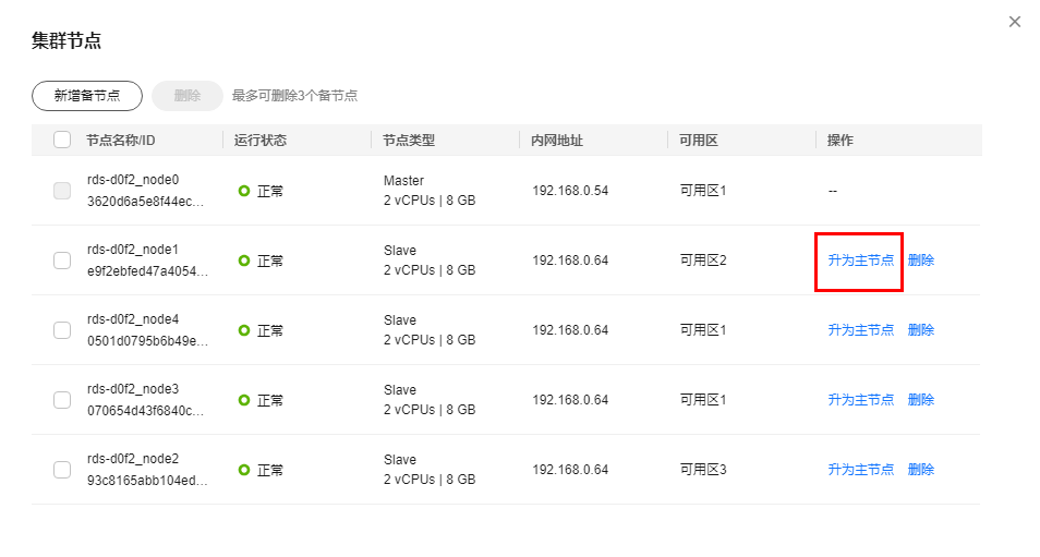 rds for mysql集群版实例创建成功后,会在同一区域内为该实例创建一个或多个备节点。主备节点的数据会实时同步,备节点同时具备读能力,主节点和备节点用户都可以访问。您可根据业务需要,将备节点升为主节点,升级后原来的主节点会变成备节点,可实现机架级别的容灾。