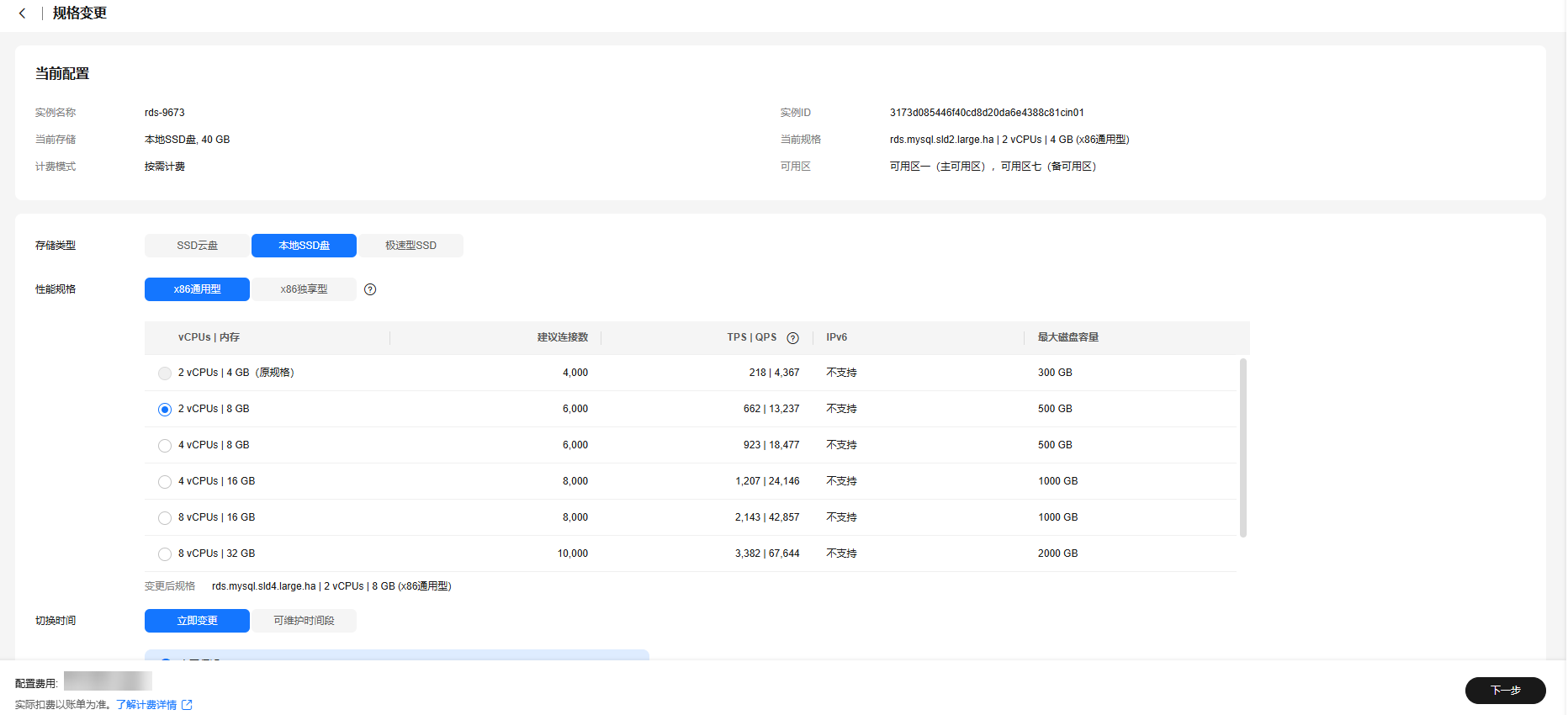 ,选择“数据库 > 云数据库 rds”,进入rds信息页面。 - 在“实例管理”页面,选择本地盘实例,单击“操作”列的,进入“规格变更”页面。