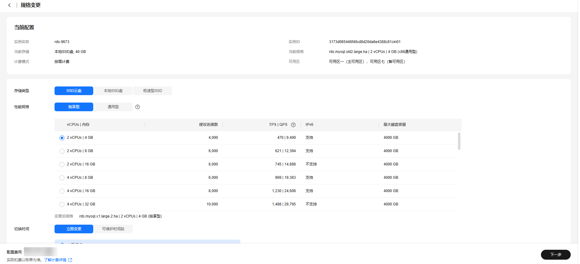 - 在“规格变更”页面,选择极速型ssd存储类型,单击“下一步”。