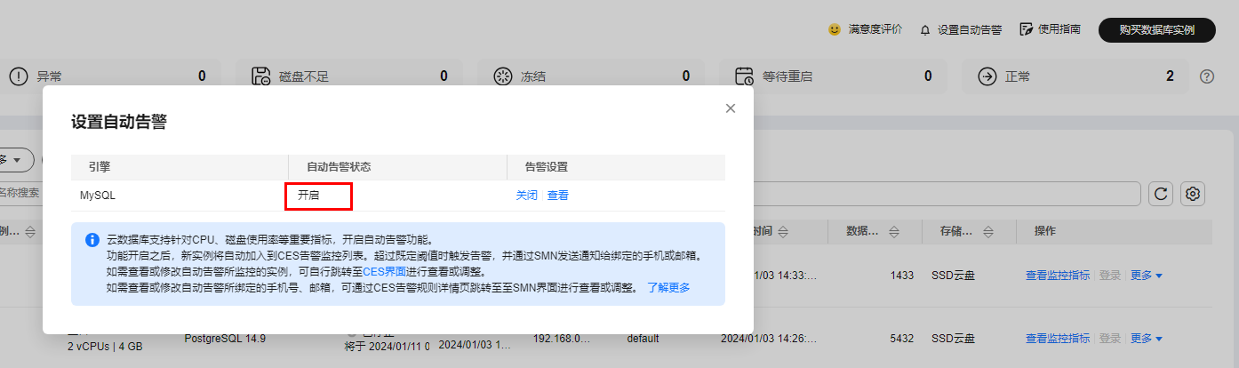 ,选择“数据库 > 云数据库 rds”,进入rds信息页面。 - 单击右上角“设置自动告警”按钮,弹出设置自动告警弹框。