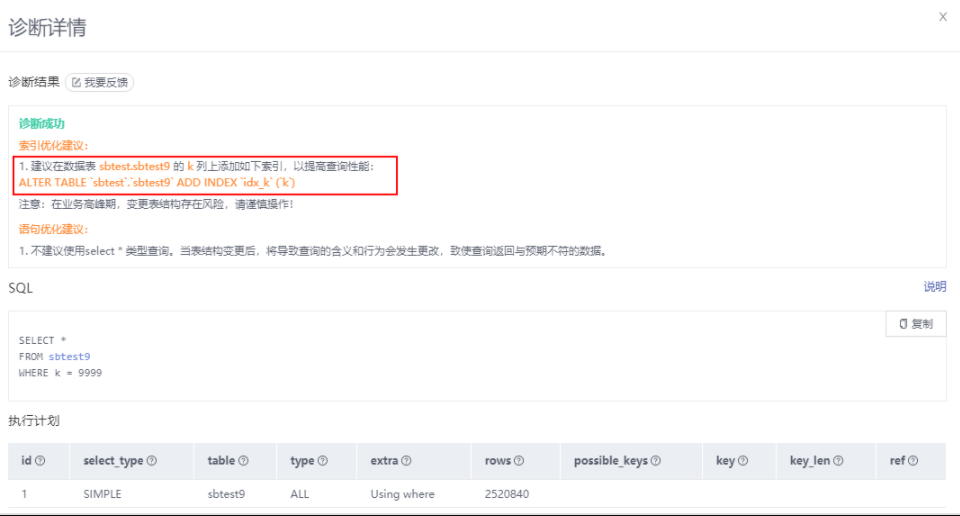 - 查看诊断详情,获取语句优化建议。