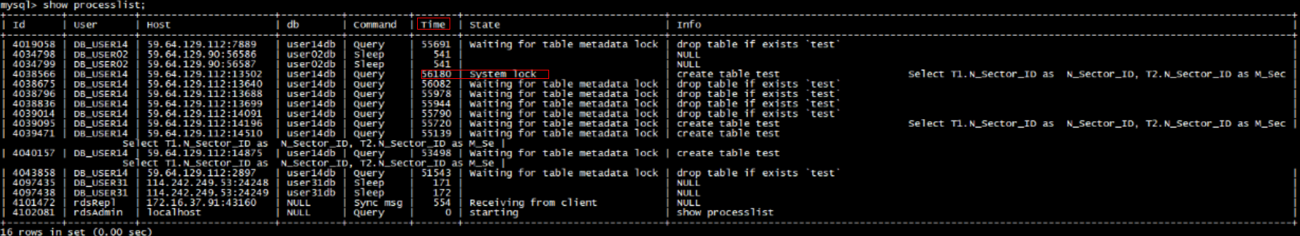 查看time和state列,如下图,长事务的id为4038566。