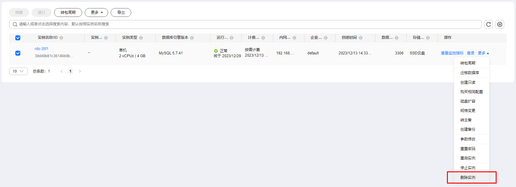 ,选择“数据库 > 云数据库 rds”,进入rds信息页面。 - 在“实例管理”页面的实例列表中,勾选需要删除的mysql按需计费实例,在实例列表上方,选择。
