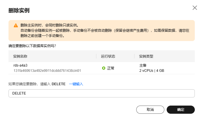 - 删除主实例时,会同步删除其对应的备实例和只读实例,请您谨慎操作。