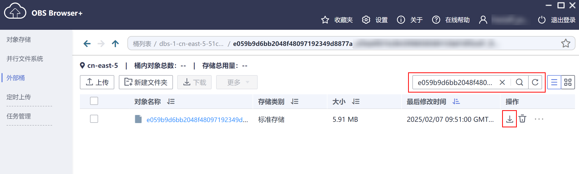 在obs browser 界面,单击添加成功的外部桶桶名,进入对象列表页面,在右侧搜索栏,输入“备份文件名称”并检索,单击