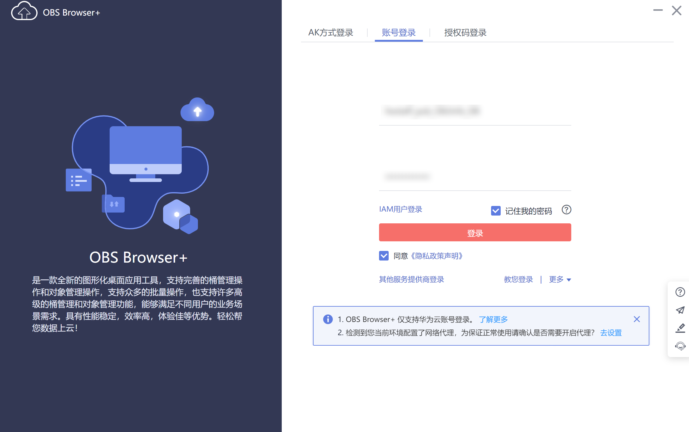 - 使用下载指导页面步骤2的用户名,登录客户端工具obs browser 。
