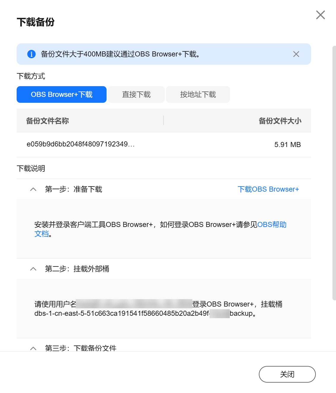 - 若备份文件大于400mb,建议您使用obs browser 下载。