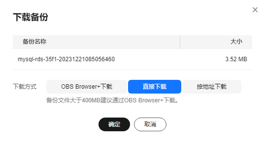 - 在弹出框中,选择“直接下载”,单击“确定”,通过浏览器直接下载数据库实例的备份文件。