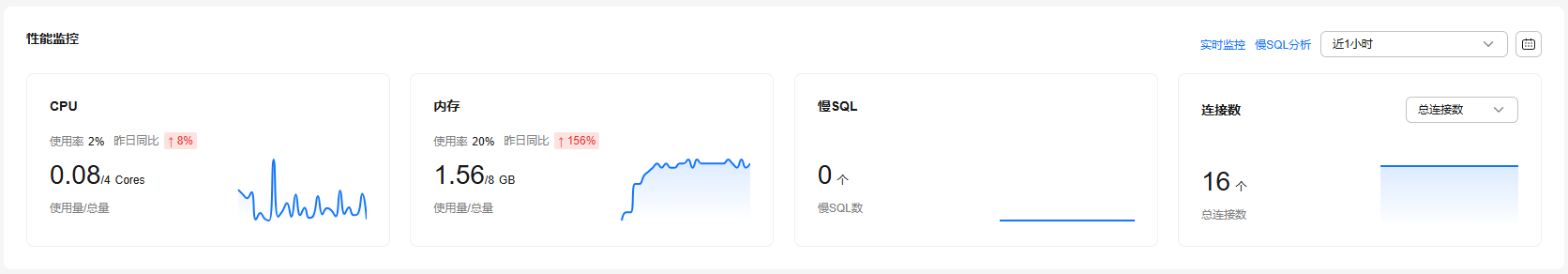 查看实例的重点性能指标,包括cpu使用率、内存使用率、慢sql数、连接数。 |