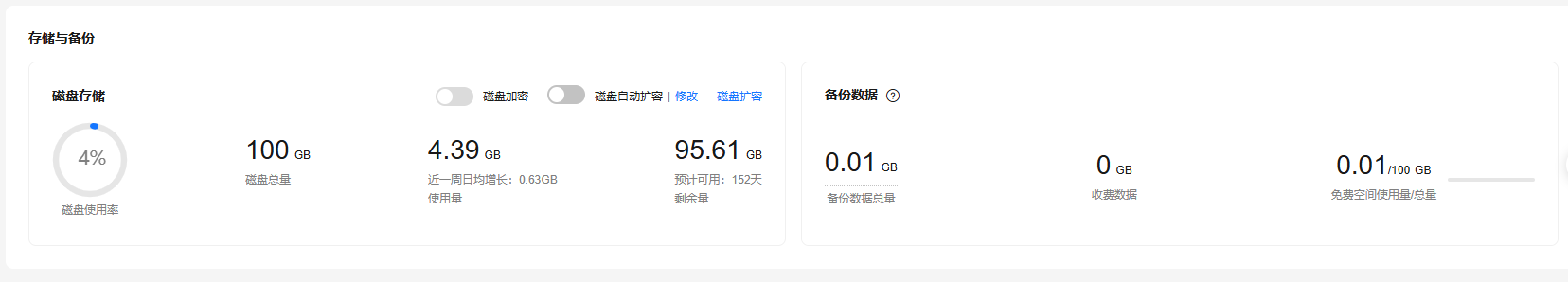 在“存储与备份”模块,查看实例的磁盘空间和备份空间使用情况,并提供磁盘加密、磁盘扩容功能。