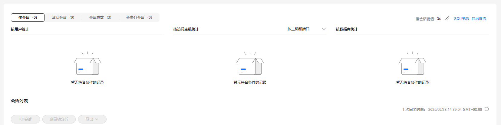 在会话统计信息区域,可以查看会话概要(如慢会话数、活跃会话数、会话总数和长事务会话)分别按照用户、访问主机和数据库维度统计的会话结果。