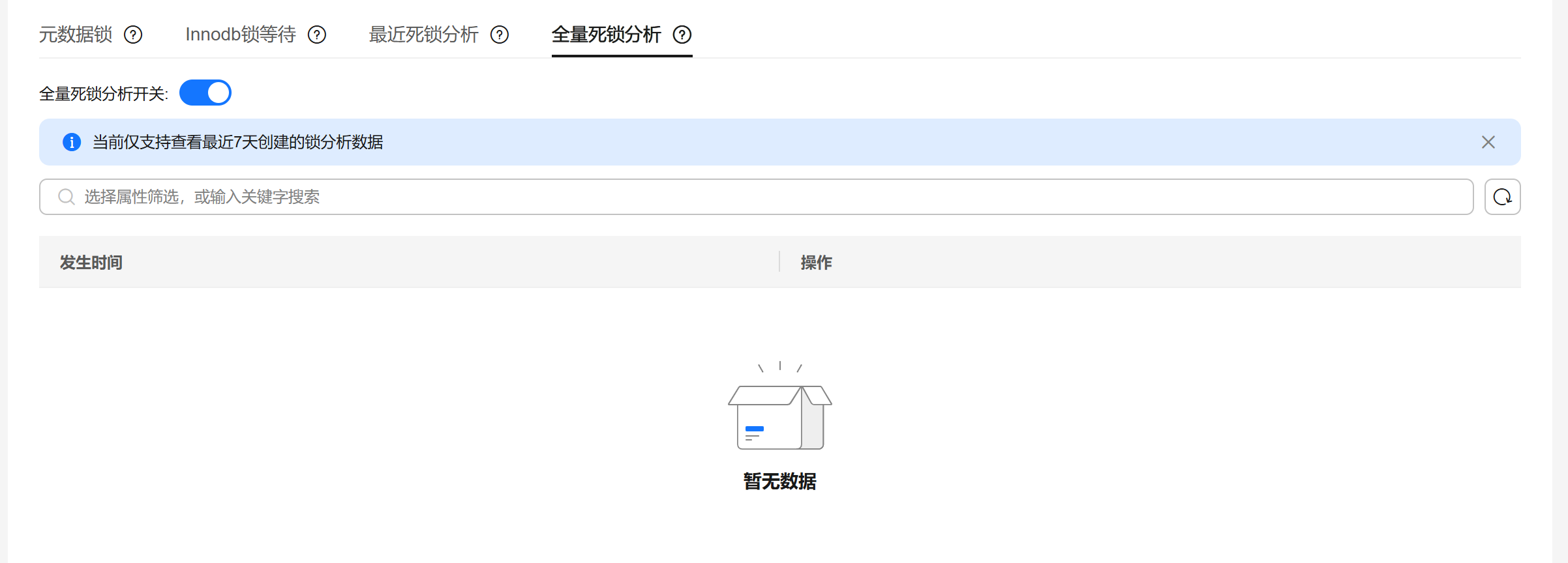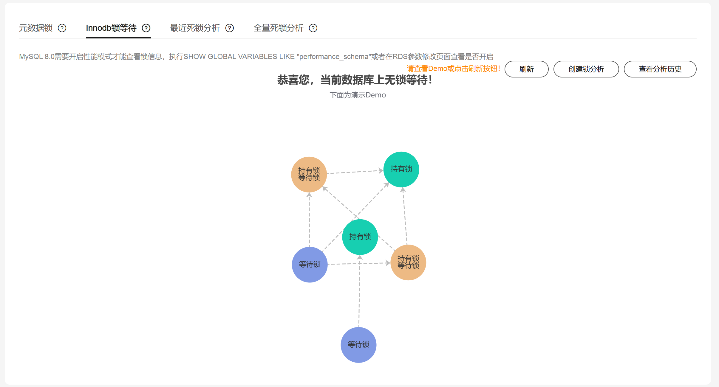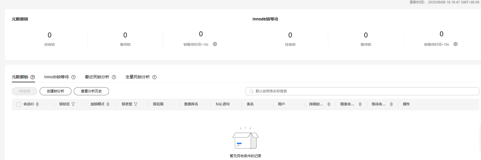 - 在“元数据锁”页签,支持创建锁分析,查看当前数据库是否有元数据锁。