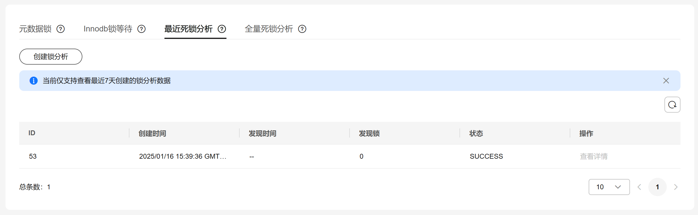 仅支持查看最近7天创建的锁分析数据。图3 最近死锁分析